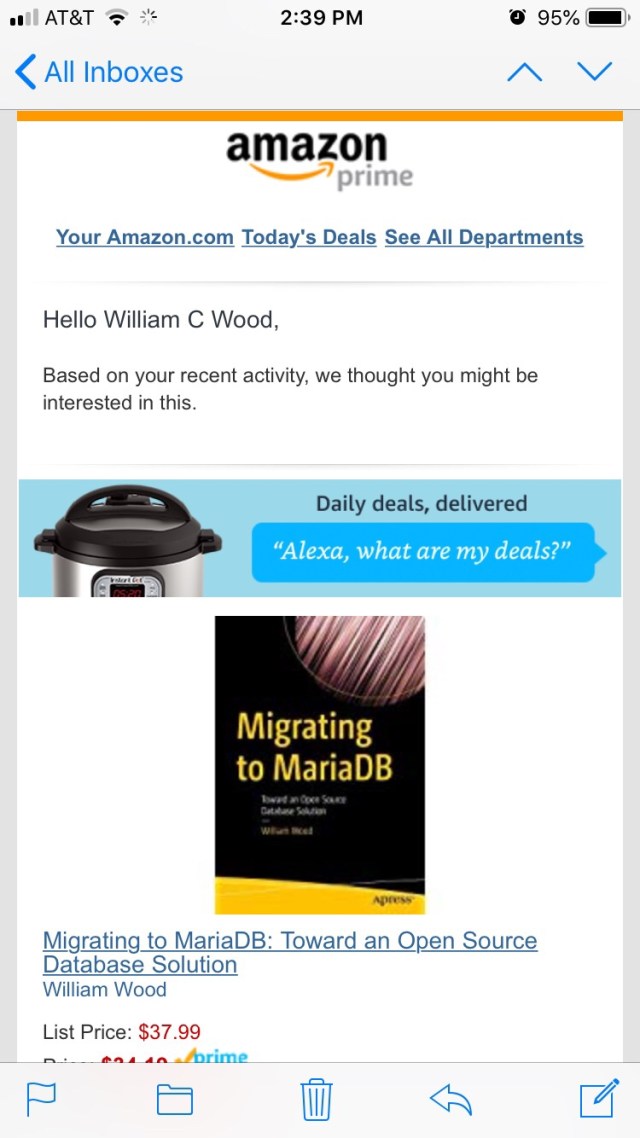 Back to the email that prompted this blog entry, it seems that due to my recent activity that Amazon Prime decided that they had something worth emailing me about that I might be really interested in purchasing. This item turned out to be my very own book: Migrating to MariaDB by none other than William Wood….LOL