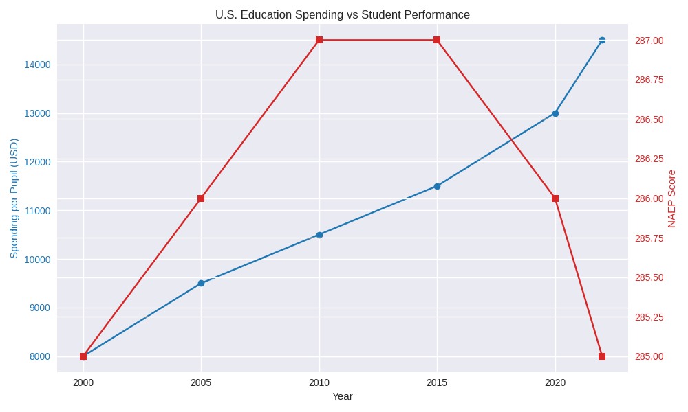 Despite record-high per-pupil spending, U.S. student performance has remained flat or declined on national assessments like the NAEP. In fact, high-spending states like New York and D.C. often underperform compared to lower-spending states like Utah and Idaho (Clarey, 2024). This chart illustrates the growing gap between spending and outcomes, a clear sign of systemic misalignment.