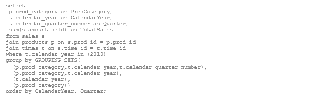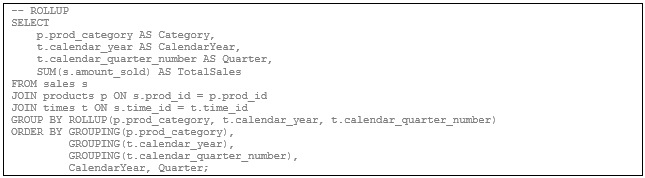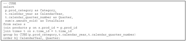 Examples using the grouping extensions CUBE, ROLLUP, and GROUPING SETS based on the Oracle Sales History data warehouse. These are commonly referred to as multi-dimensional aggregation techniques.