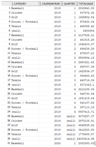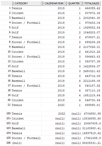 - Subtotals across every combination of dimensions, along with grand total.